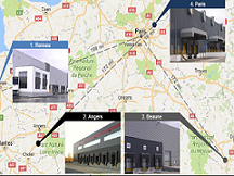 Modern warehouses located throughout France, one near Paris CDG Airport, one along the A6 main logistics corridor (Marseille-Lyon-Paris-Lille), and two in western France.